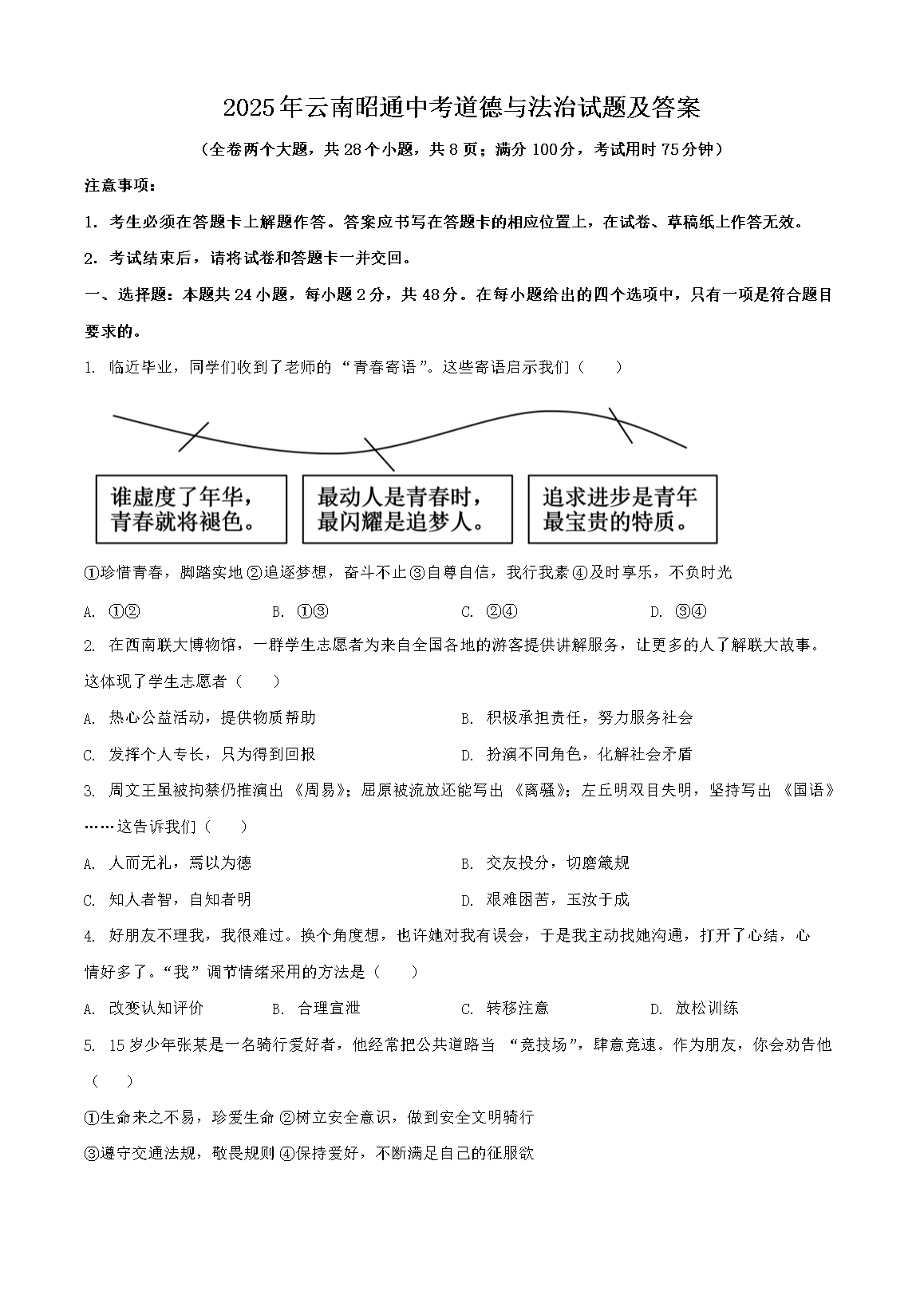 【文档名称】 2025年云南昭通中考道德与法治试题及答案(Word版).doc