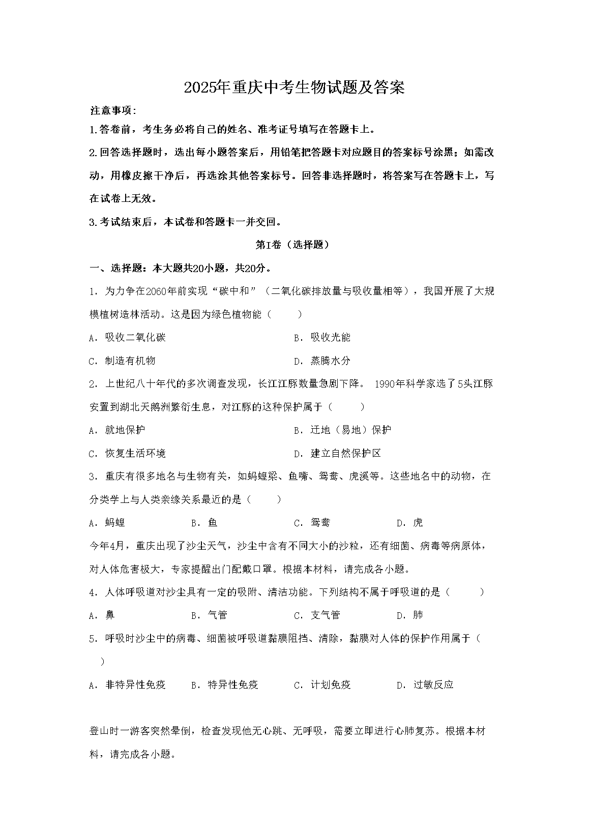 【文档预览】 无忧考网整理发布2025年重庆中考生物试题及答案(Word版),前五页预览如下: