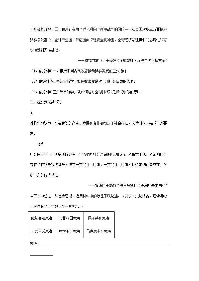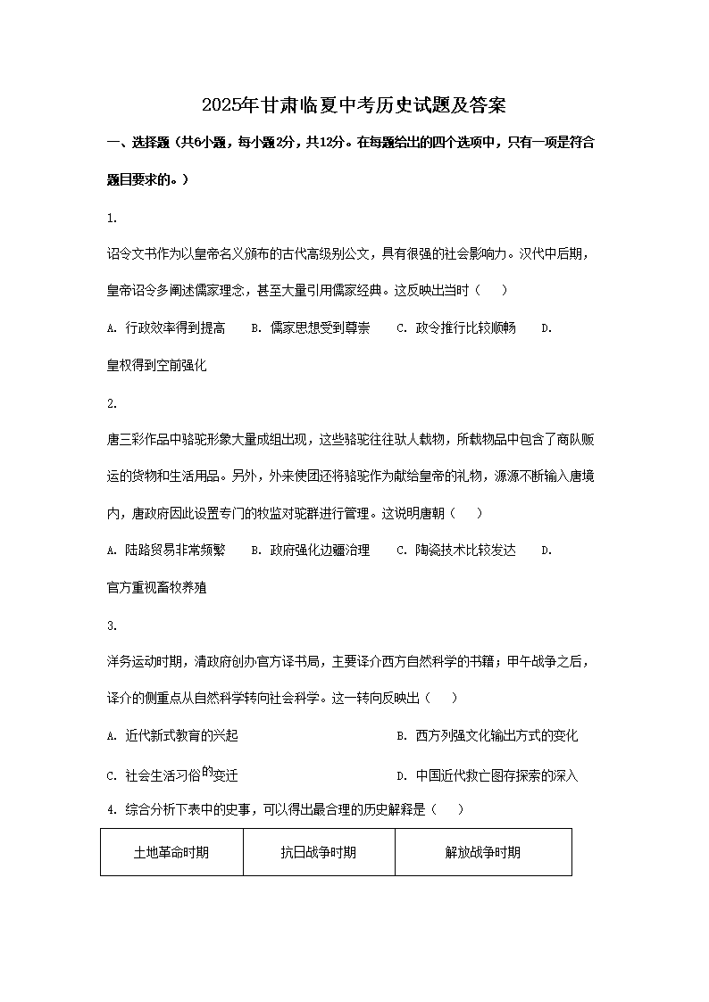 【文档名称】 2025年甘肃临夏中考历史试题及答案(Word版).doc