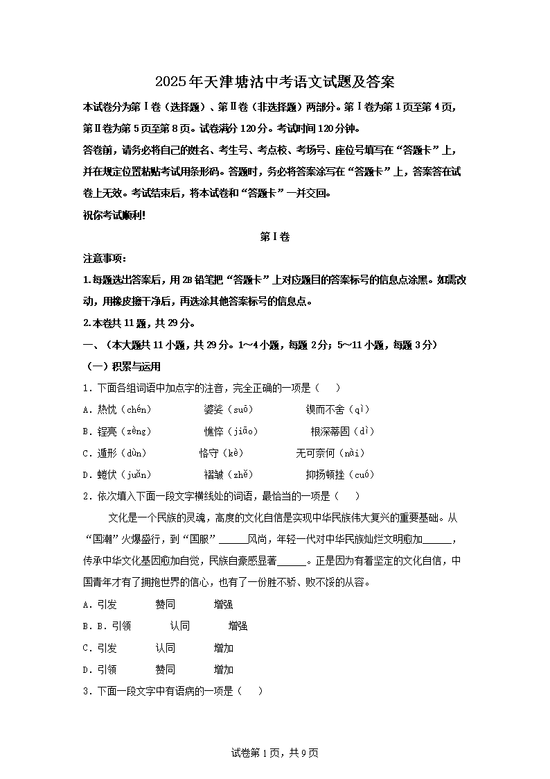 【文档名称】 2025年天津塘沽中考语文试题及答案(Word版).doc