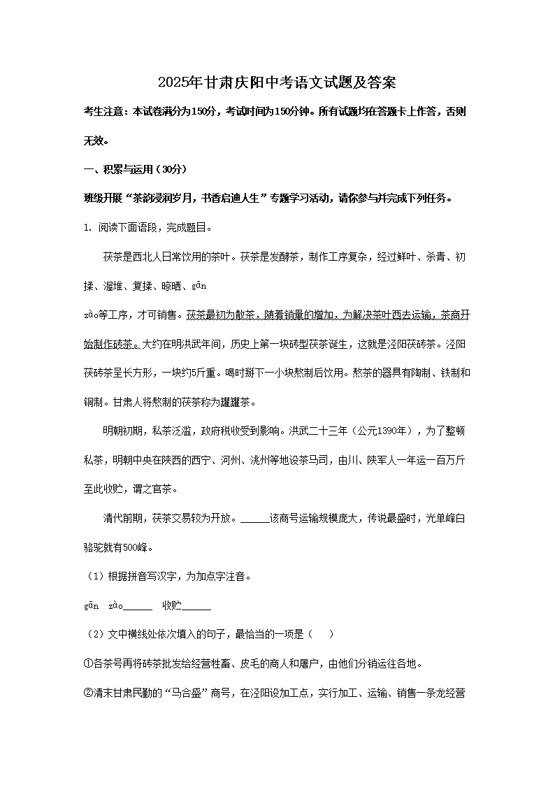 【文档名称】 2025年甘肃庆阳中考语文试题及答案(Word版).doc