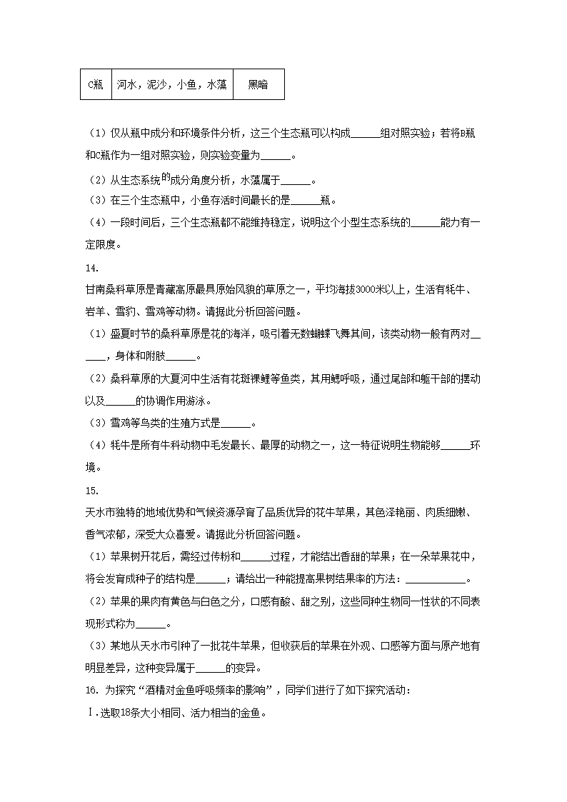 【文档名称】 2025年甘肃天水中考生物试题及答案(Word版).doc