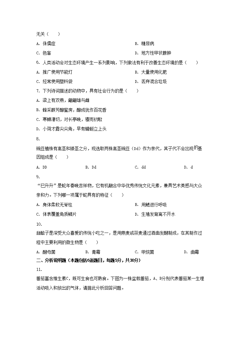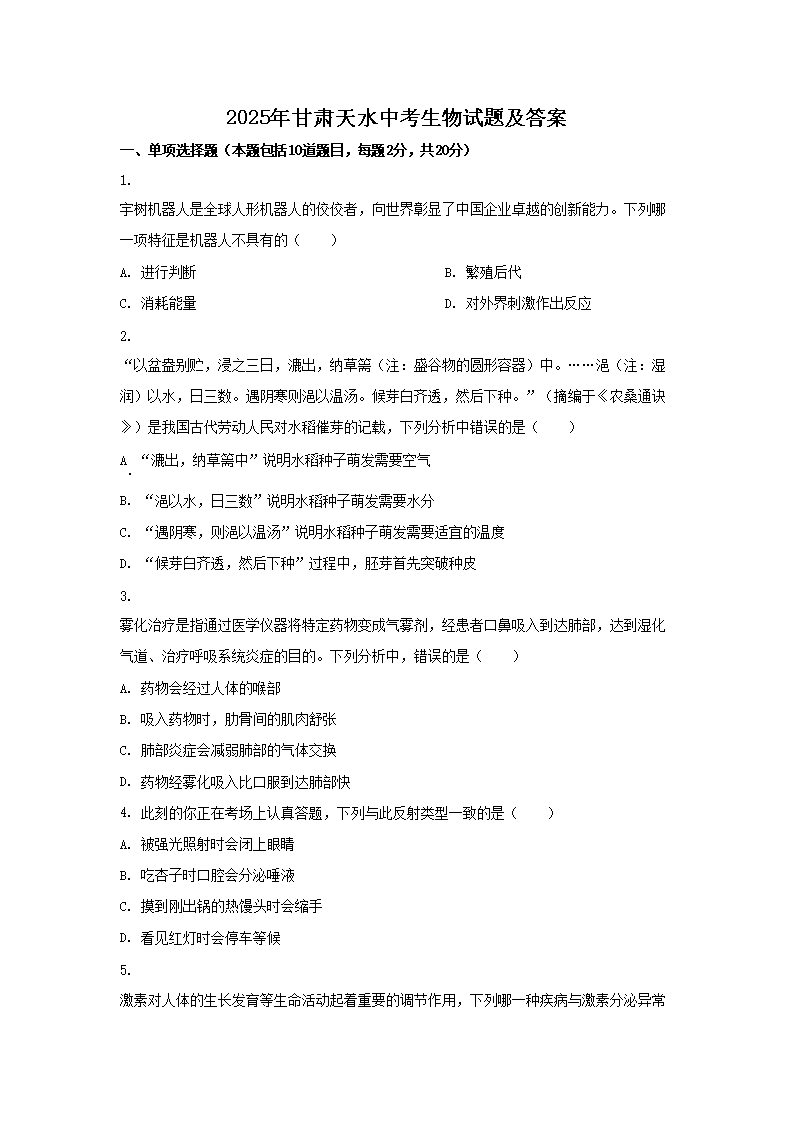 【文档预览】 无忧考网整理发布2025年甘肃天水中考生物试题及答案(Word版),前五页预览如下: