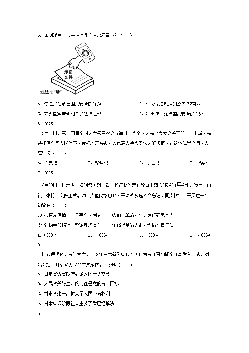 【文档名称】 2025年甘肃张掖中考道德与法治试题及答案(Word版).doc