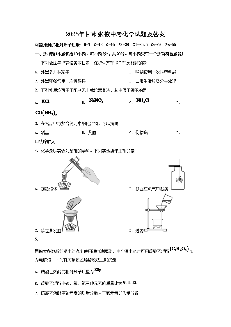 【文档名称】 2025年甘肃张掖中考化学试题及答案(Word版).doc
