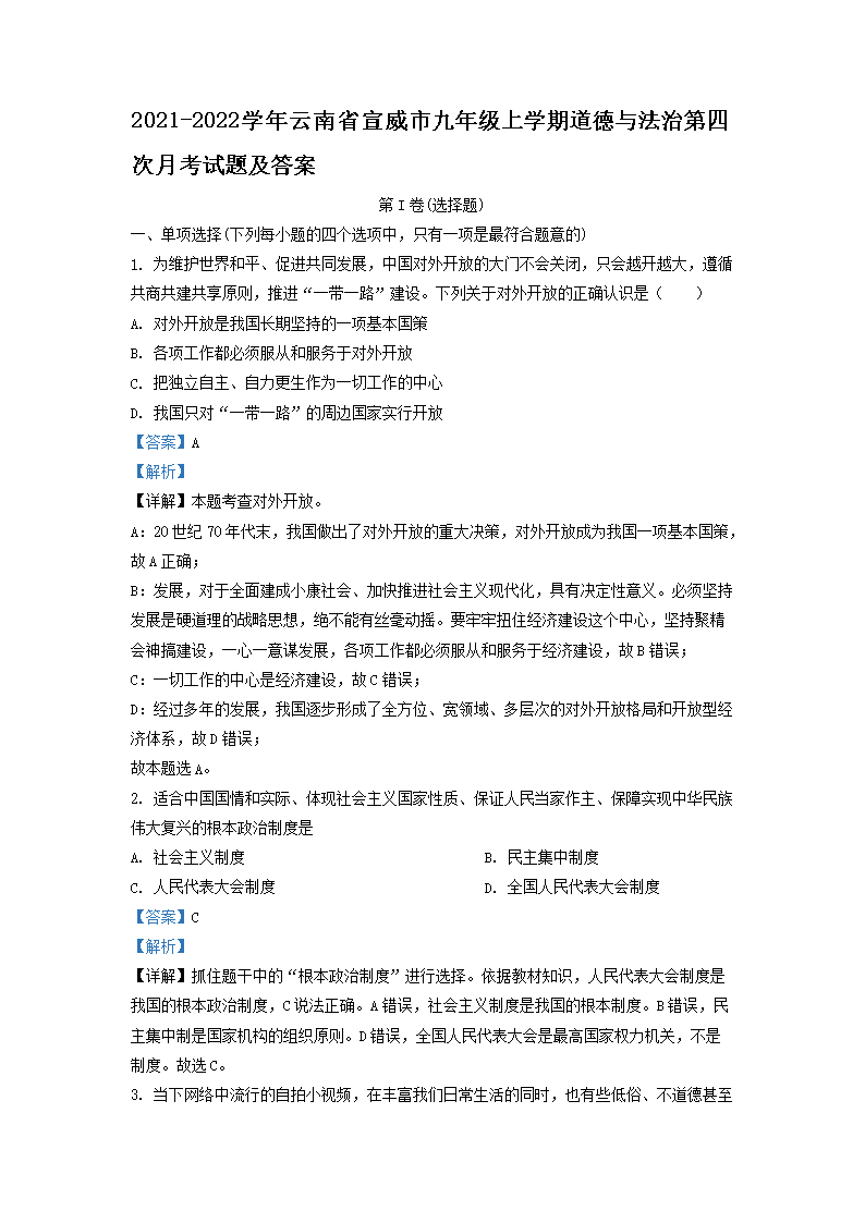 【文档名称】 2021-2022学年云南省宣威市九年级上学期道德与法治第四次月考试题及答案(Word版).doc