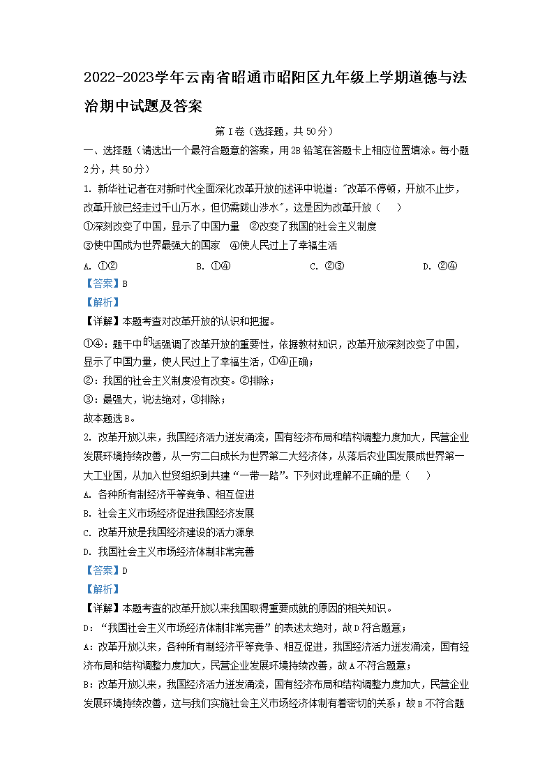 【文档名称】 2022-2023学年云南省昭通市昭阳区九年级上学期道德与法治期中试题及答案(Word版).doc