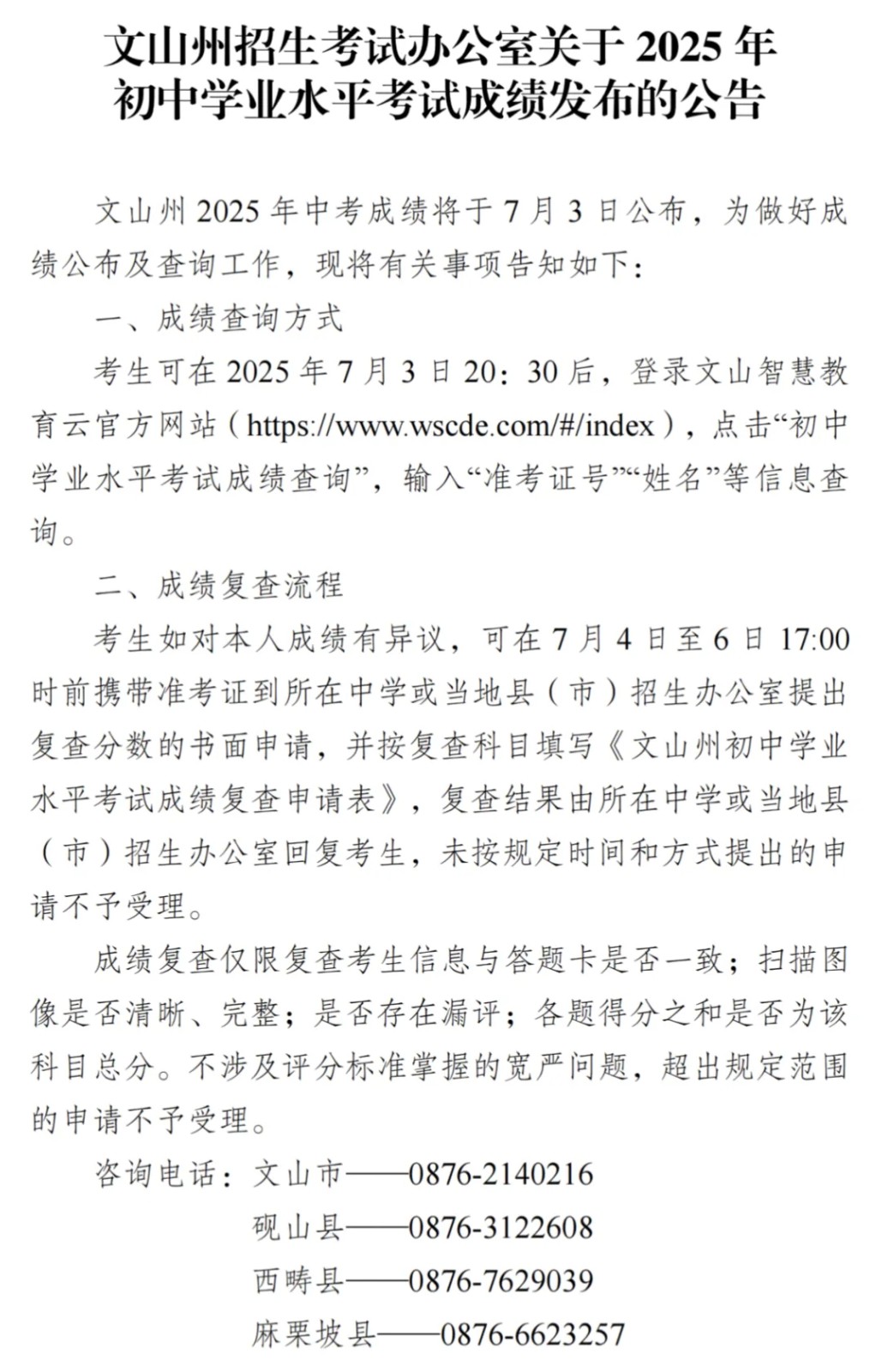 文山州教育体育局查分:2025年云南文山州中考成绩查询入口开通