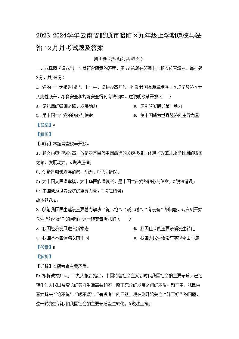 【文档名称】 2023-2024学年云南省昭通市昭阳区九年级上学期道德与法治12月月考试题及答案(Word版).doc
