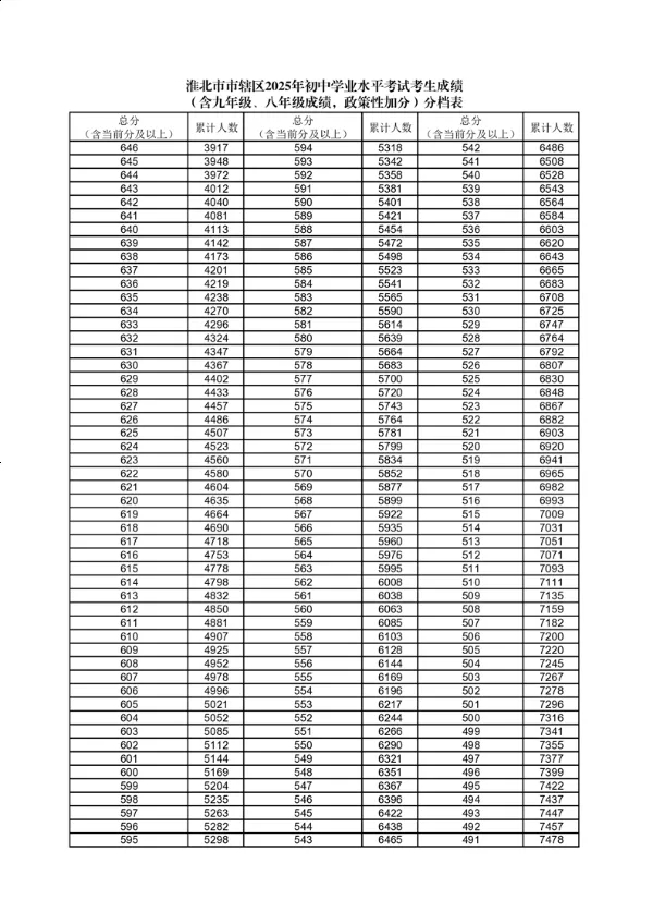 安徽淮北市市辖区2025年中考考生成绩分档表