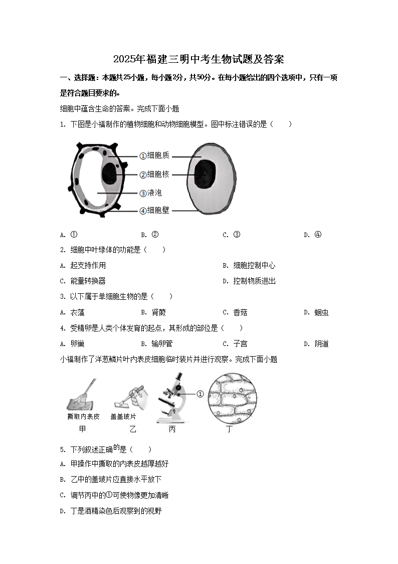【文档预览】 无忧考网整理发布2025年福建三明中考生物试题及答案(Word版),前五页预览如下: