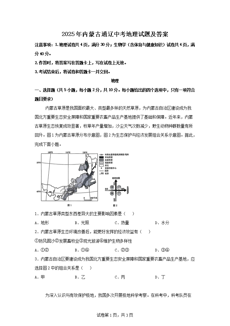 【文档预览】 无忧考网整理发布2025年内蒙古通辽中考地理试题及答案(Word版),前五页预览如下: