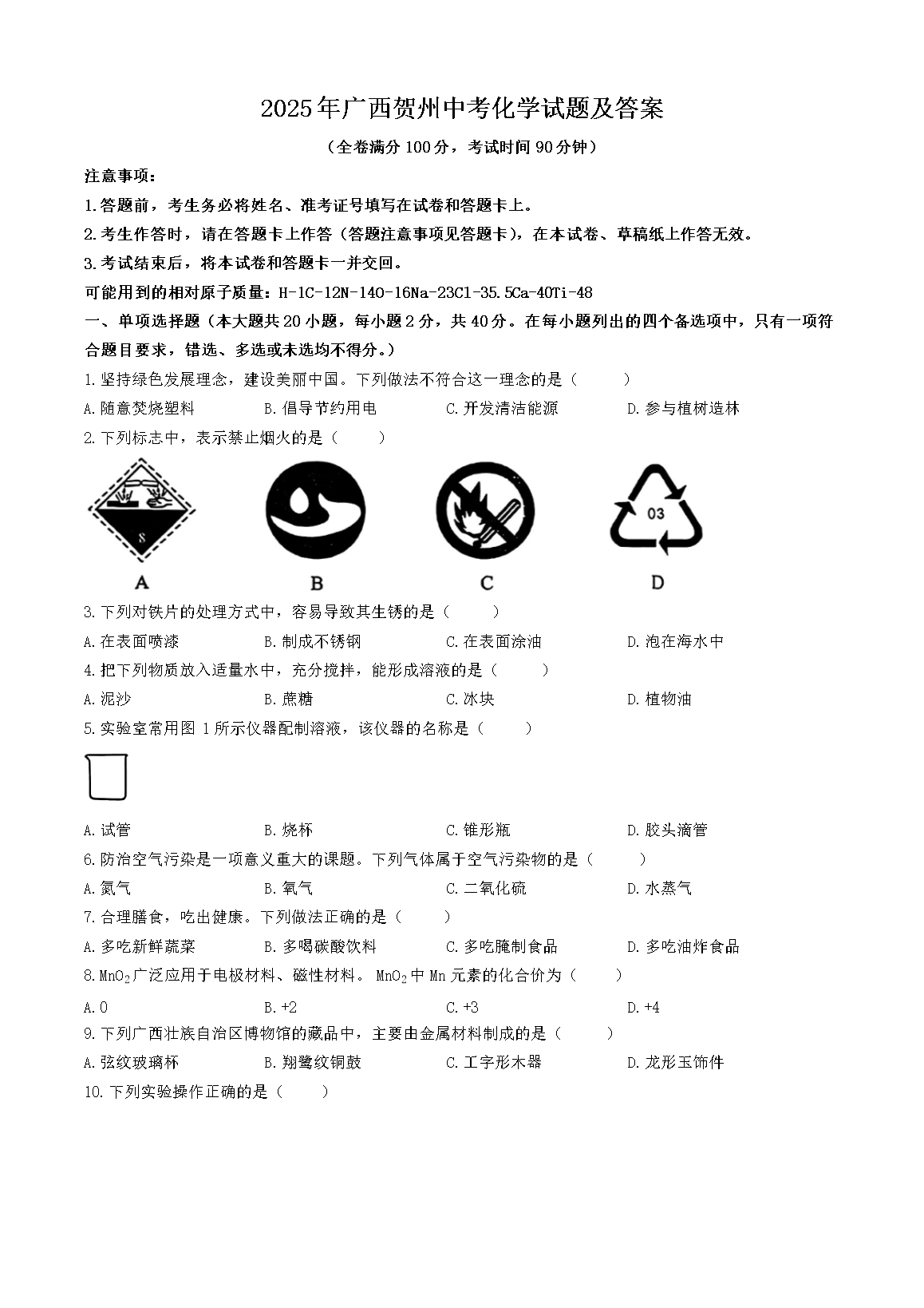 【文档名称】 2025年广西贺州中考化学试题及答案(Word版).doc