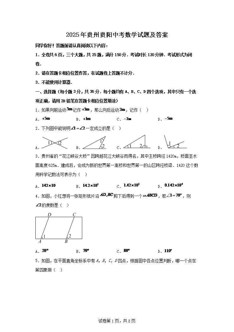 【文档名称】 2025年贵州贵阳中考数学试题及答案(Word版).doc
