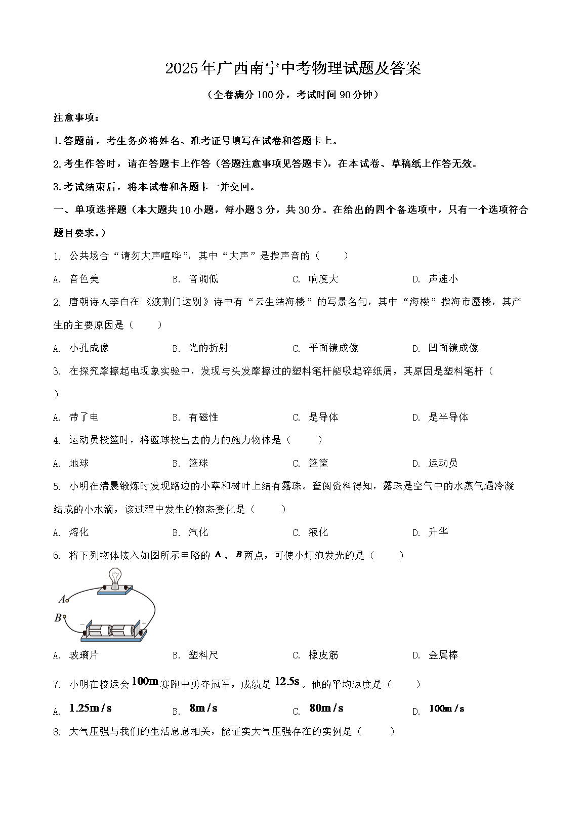 【文档名称】 2025年广西南宁中考物理试题及答案(Word版).doc