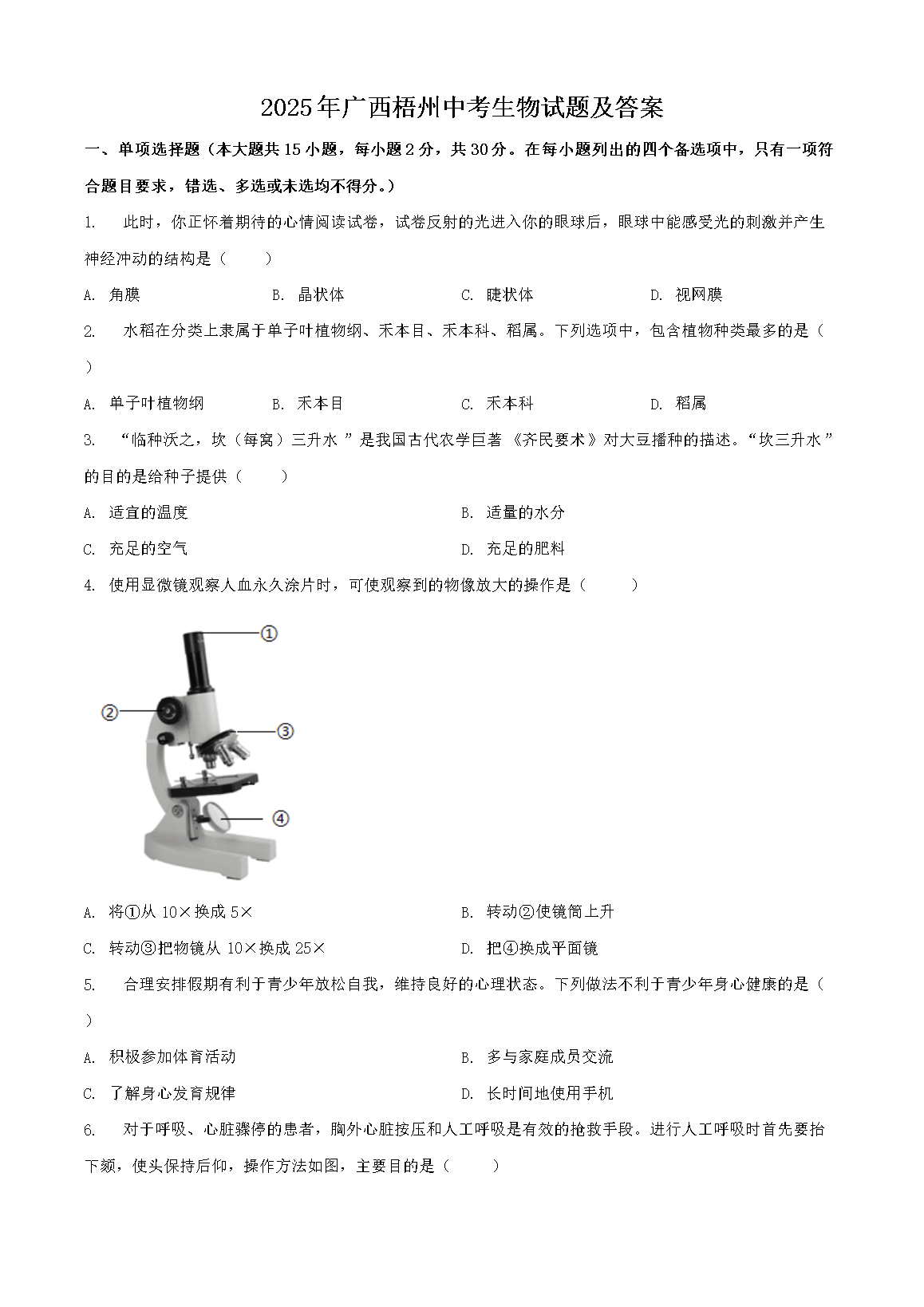 【文档预览】 无忧考网整理发布2025年广西梧州中考生物试题及答案(Word版),前五页预览如下: