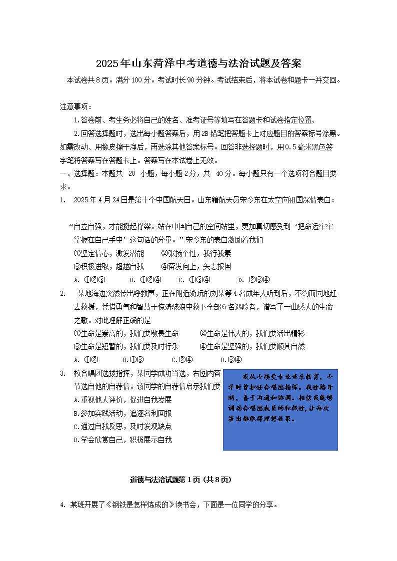 【文档名称】 2025年山东菏泽中考道德与法治试题及答案(Word版).doc