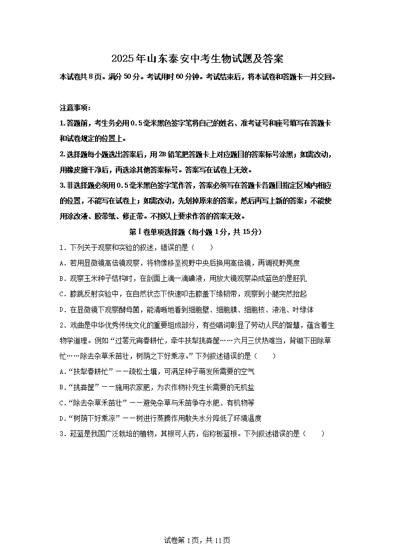 【文档预览】 无忧考网整理发布2025年山东泰安中考生物试题及答案(Word版),前五页预览如下: