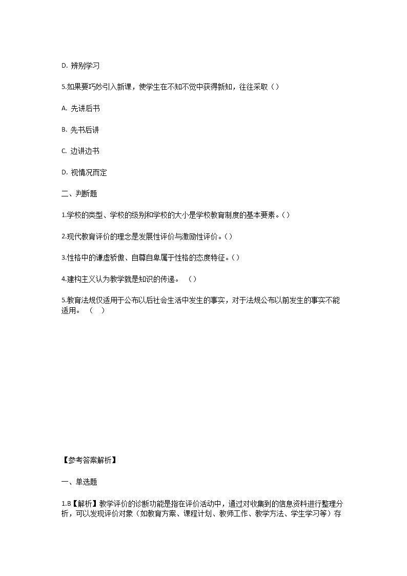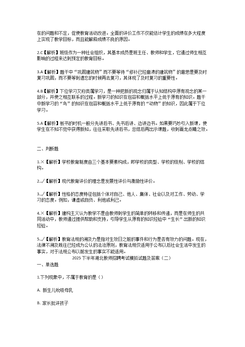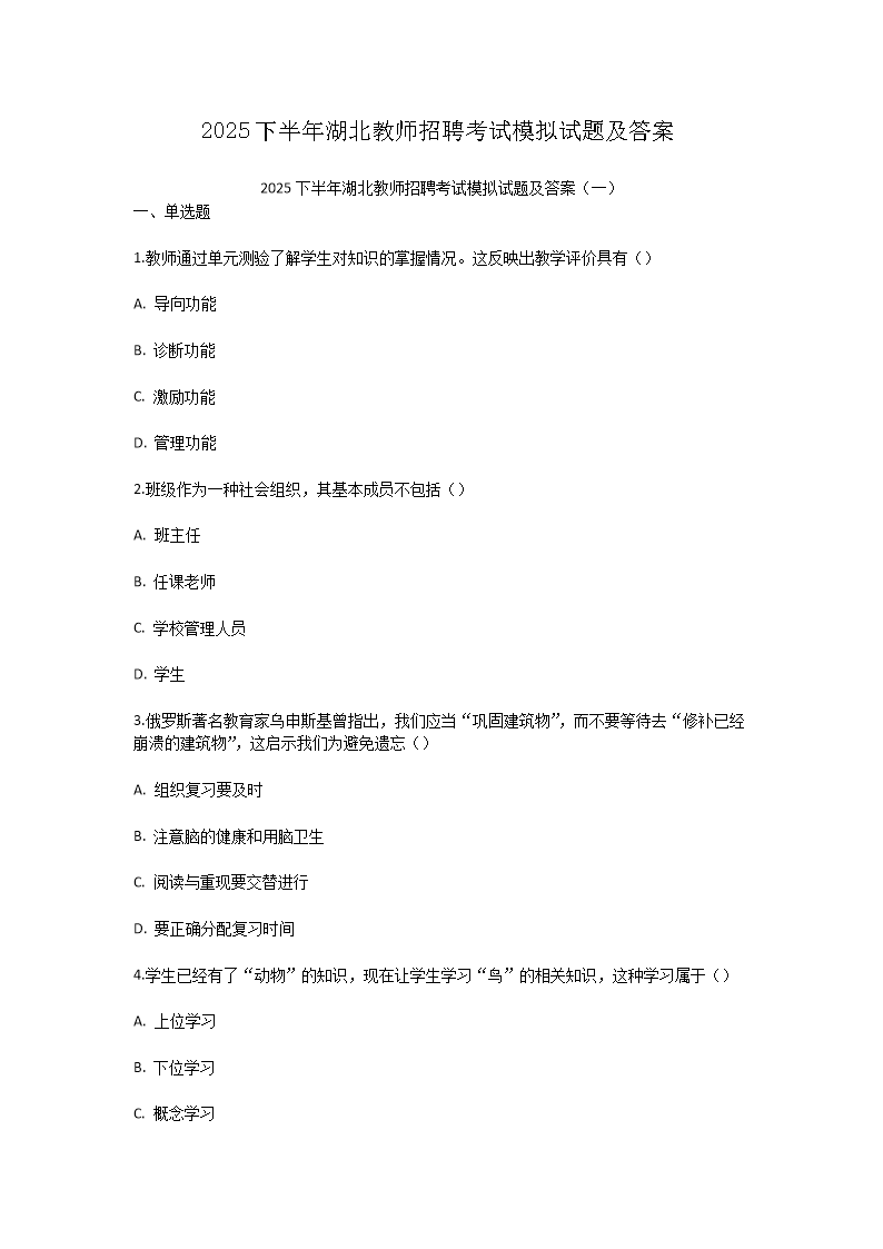 【文档名称】 2025下半年湖北教师招聘考试模拟试题及答案(Word版).doc