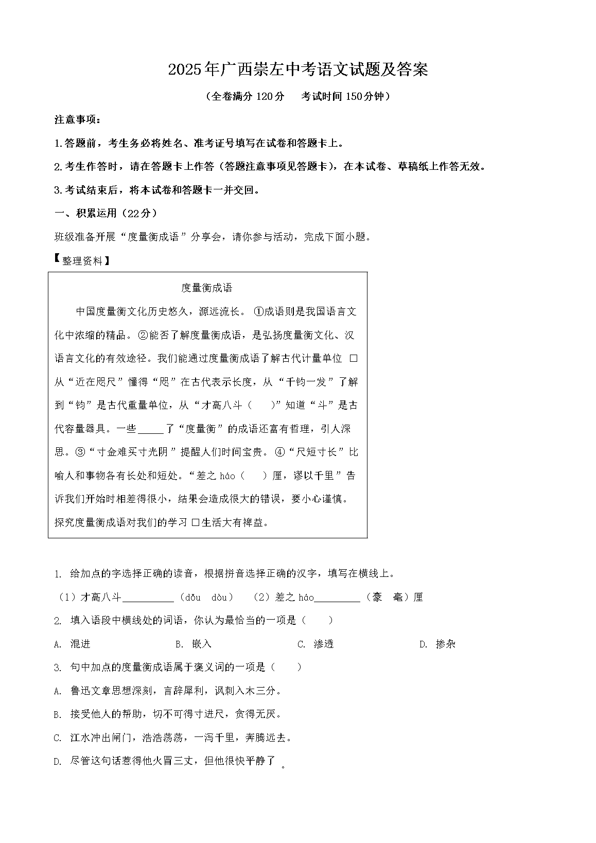 【文档名称】 2025年广西崇左中考语文试题及答案(Word版).doc