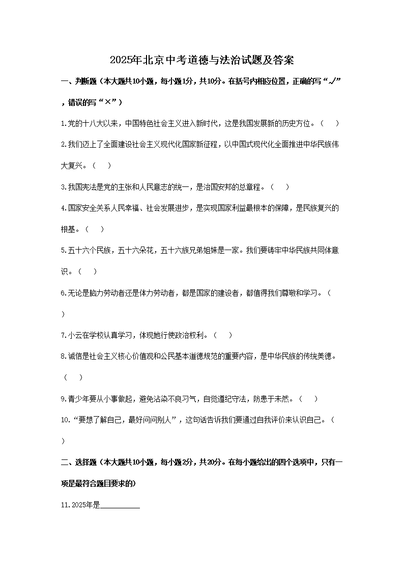 【文档名称】 2025年北京中考道德与法治试题及答案(Word版).doc
