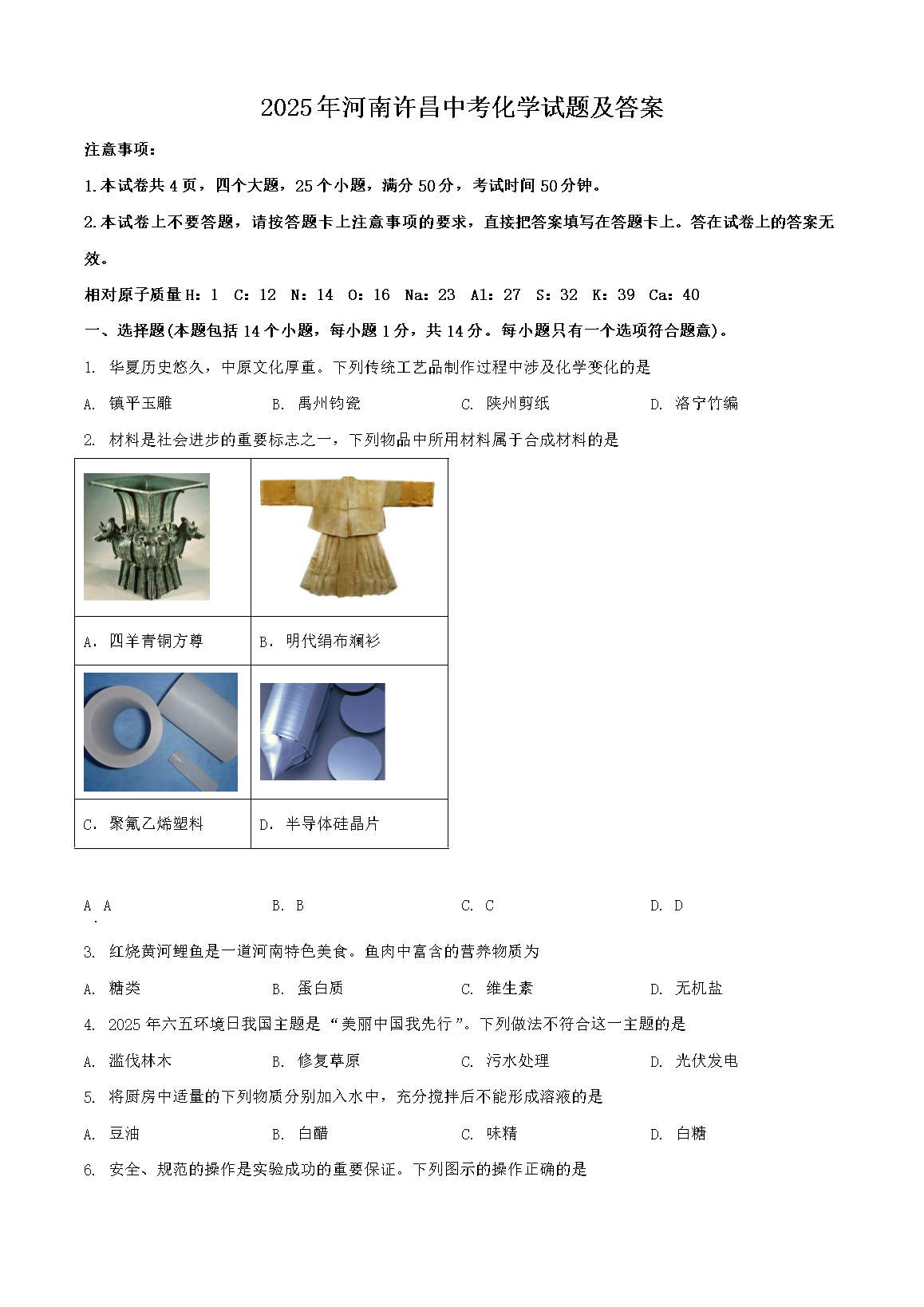 【文档名称】 2025年河南许昌中考化学试题及答案(Word版).doc