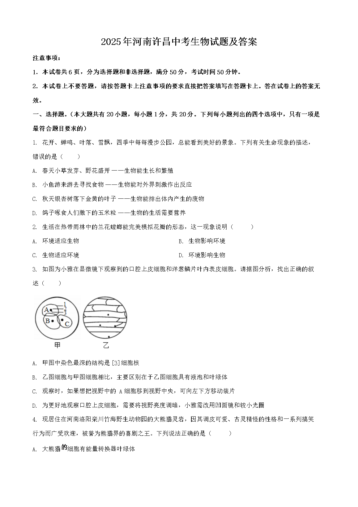 【文档预览】 无忧考网整理发布2025年河南许昌中考生物试题及答案(Word版),前五页预览如下: