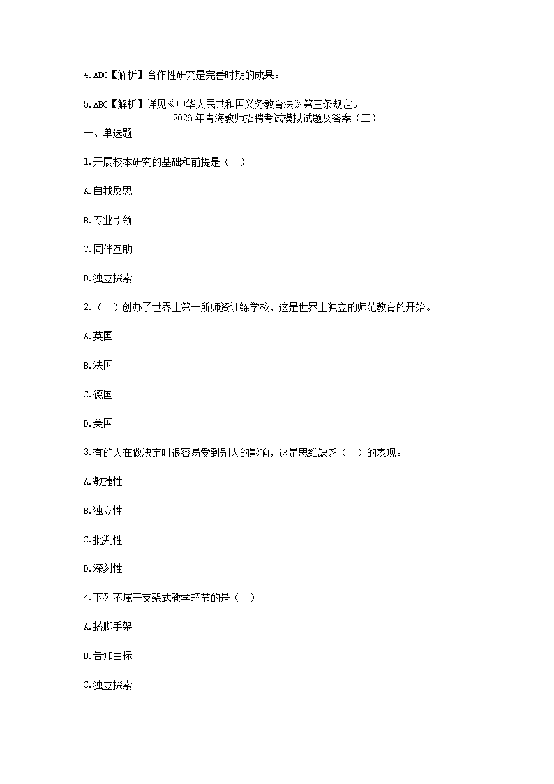 【文档名称】 2026年青海教师招聘考试模拟试题及答案(Word版).doc