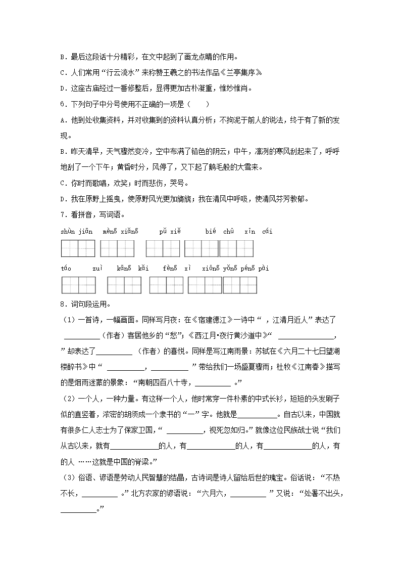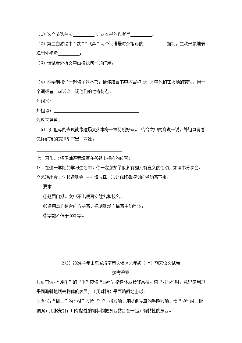 【文档名称】 2023-2024年山东省济南市长清区六年级上册期末语文试卷及答案(Word版).doc