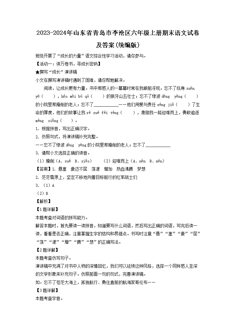 【文档预览】 无忧考网整理发布2023-2024年山东省青岛市李沧区六年级上册期末语文试卷及答案(统编版)(Word版),前五页预览如下: