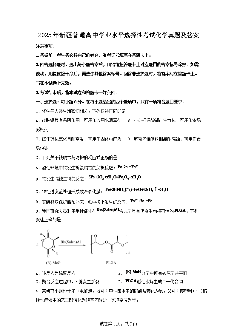 【文档名称】 2025年新疆普通高中学业水平选择性考试化学真题及答案(Word版).doc