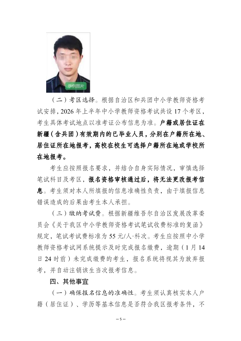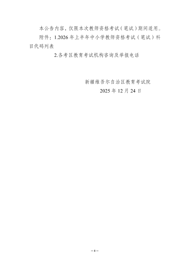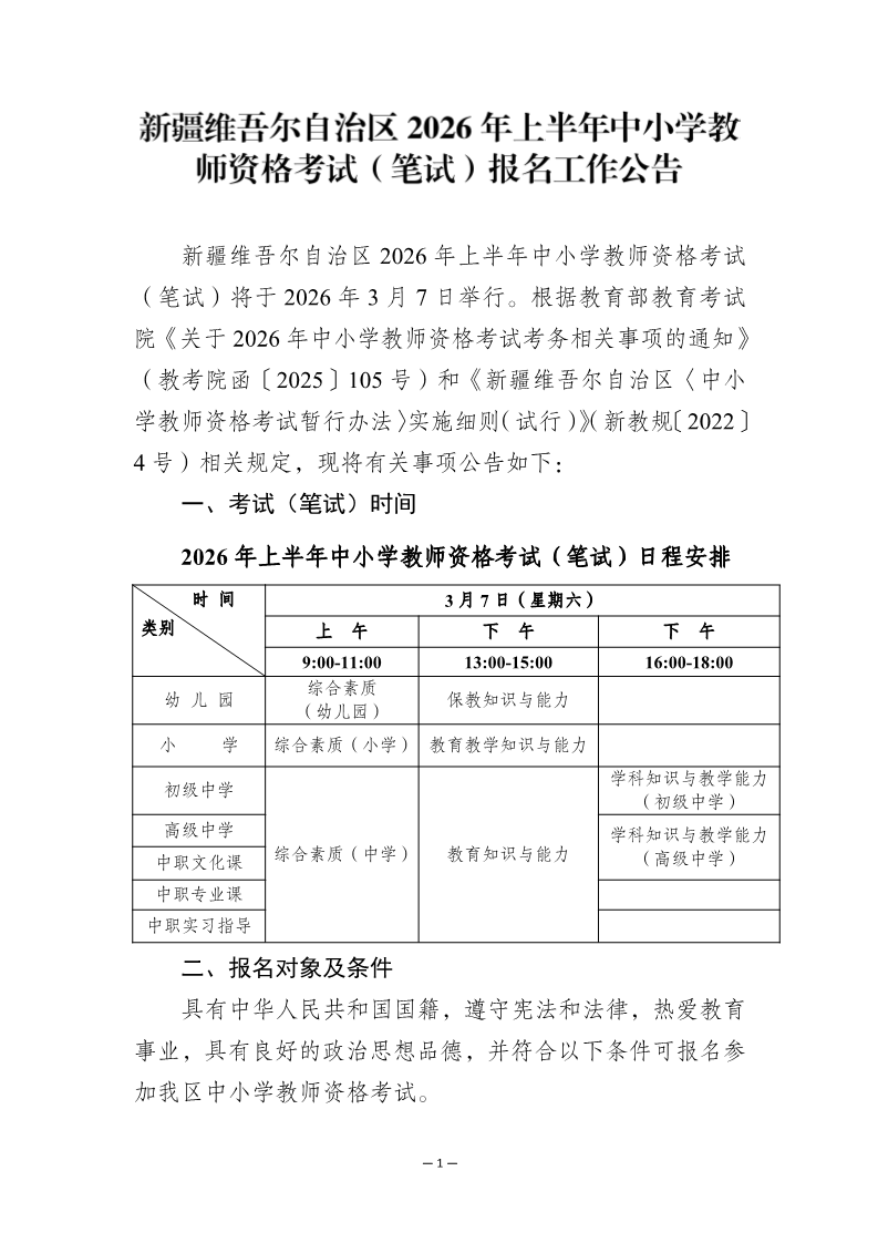 2026上半年新疆中小学教师资格考试笔试报名公告(1月9日起报考)