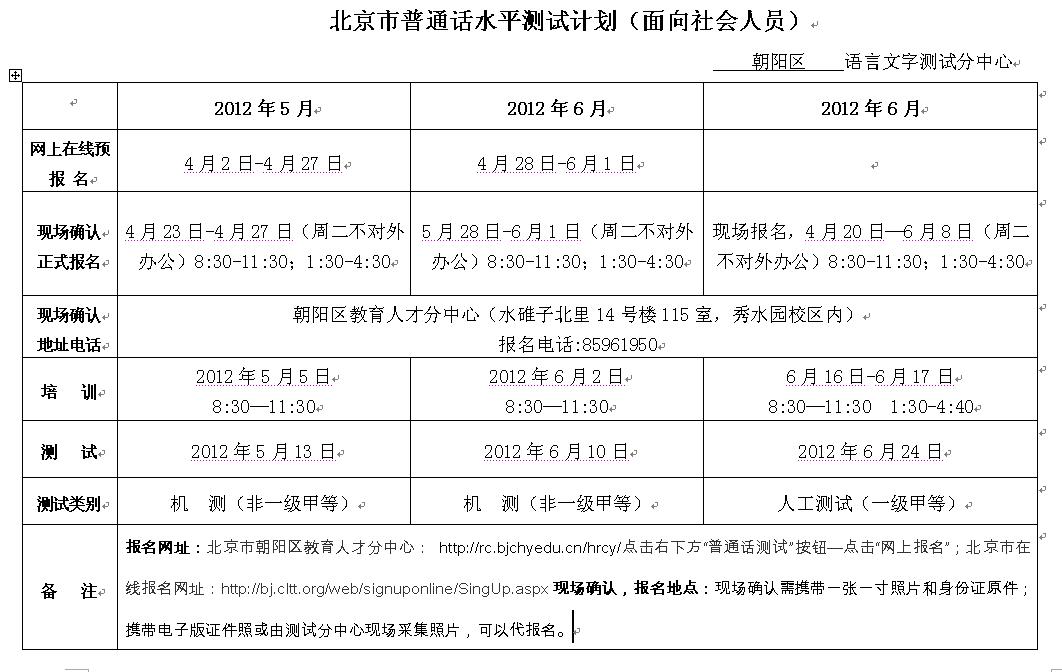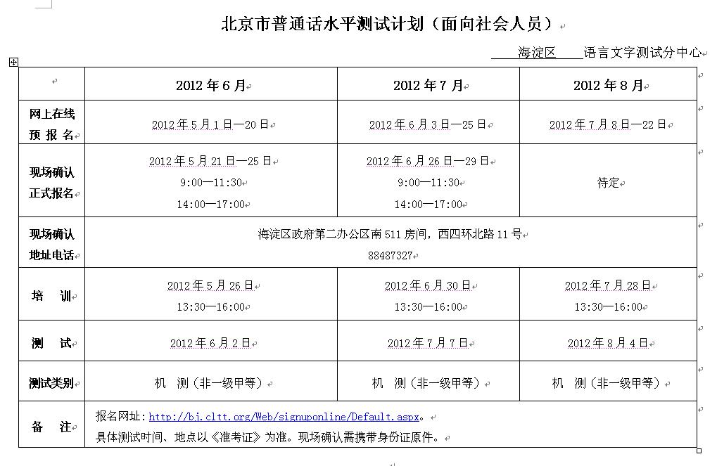 2012年5-8月北京普通话等级考试时间安排表(面向社会人员)