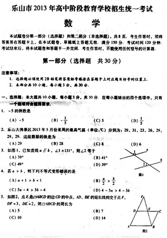 2013年四川乐山中考数学真题(完整版)