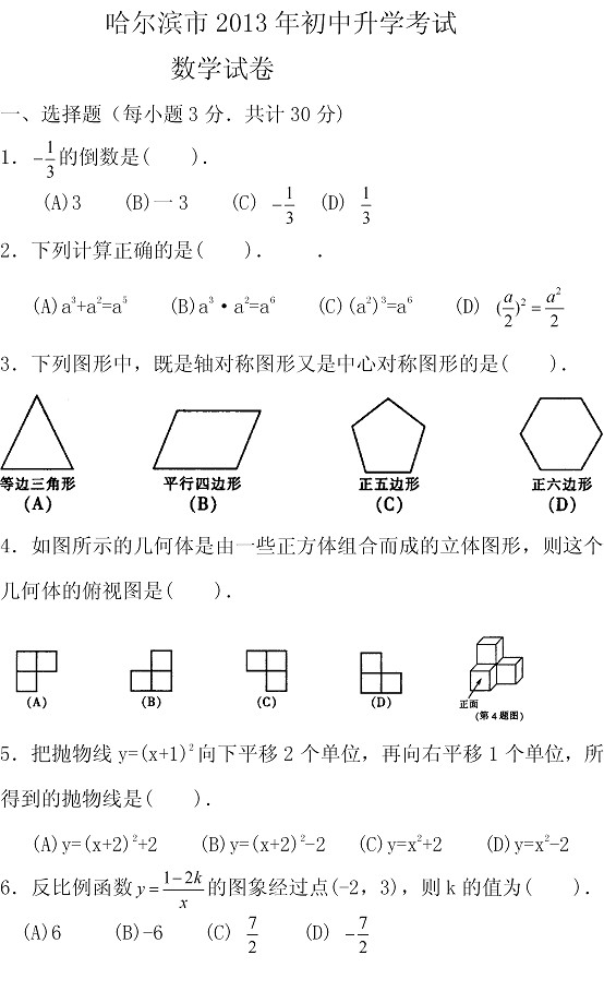 2013年黑龙江哈尔滨中考数学真题(完整.docx
