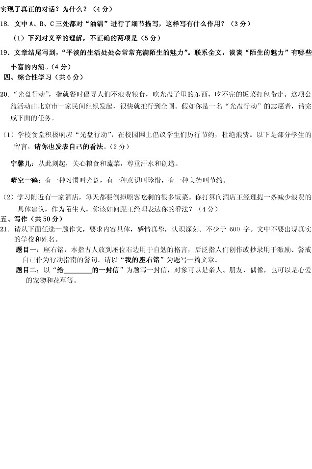 2021年山东淄博中考语文真题及答案