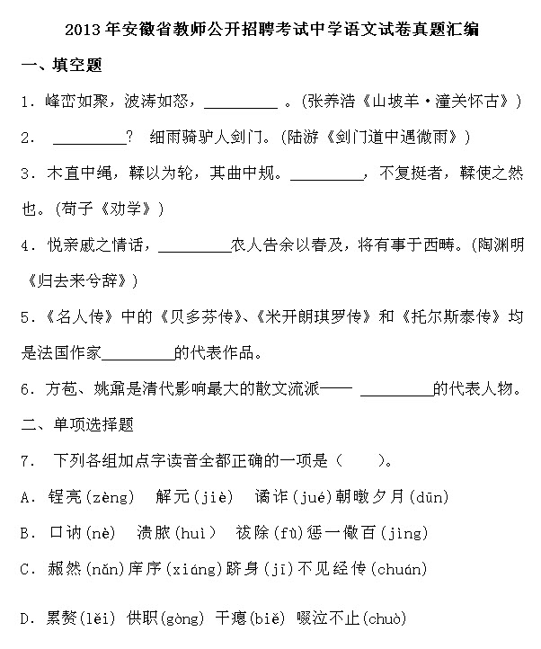 这篇《2013安徽省教师公开招聘考试中学语文真题》是©无忧考网为大家整理的,希望对大家有所帮助。以下信息仅供参考!