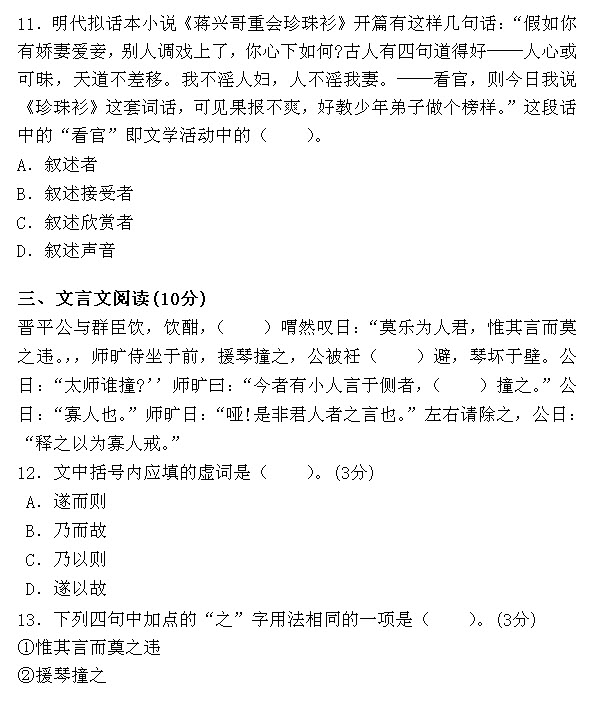 11.B[解析]作者在作为叙述者讲述故事的同时,必然在心目中有一个潜在的叙述接受者。我国古代话本中出现的“看官”即叙述接受者。故事的语境和道德意义只有对合乎作者要求的“看官”来说才是真正有意义的。因此本题选B。