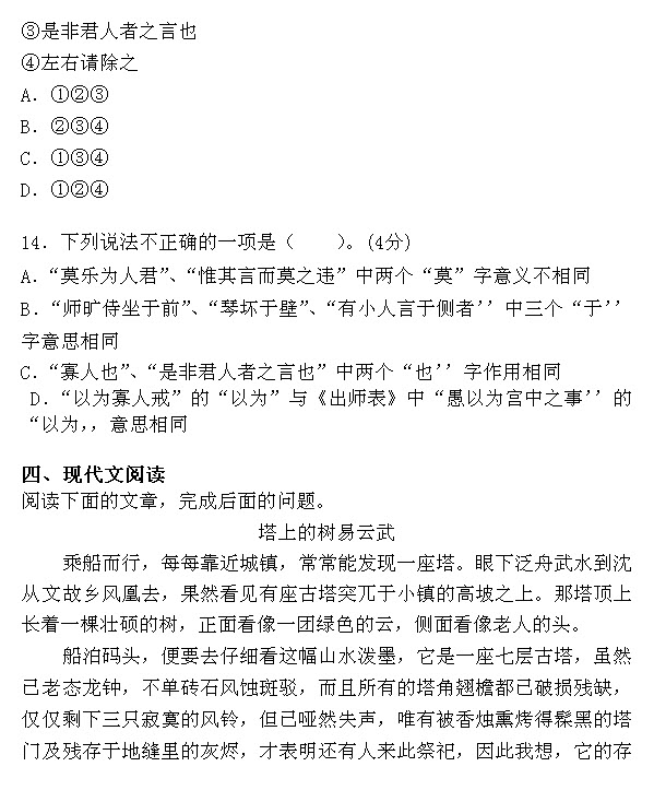 14.D[解析]D项“以为寡人戒”中的“以为”是“以(之)为”,“把它作为”的意思;“愚以为”是“我认为”。因此本题选D。