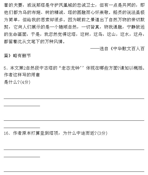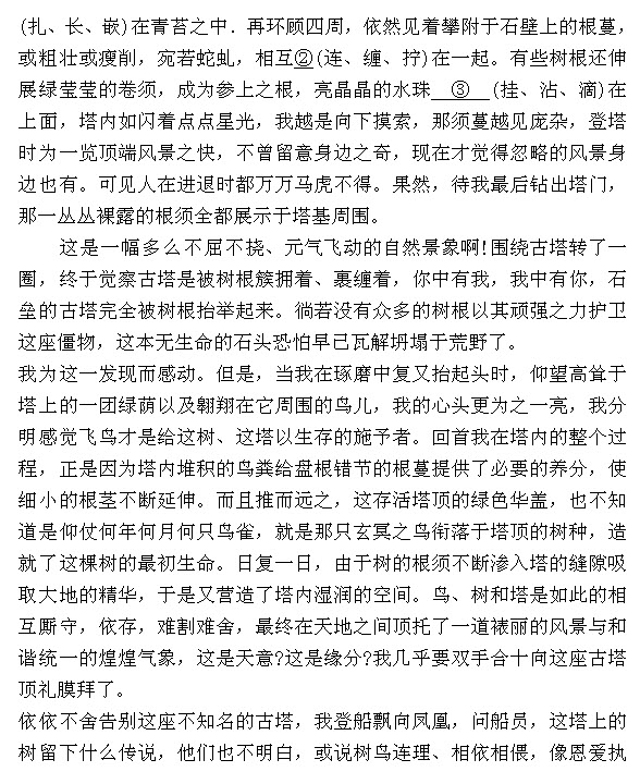 15.[参考答案]“老态龙钟”体现在砖石斑驳、塔角翘檐破损残缺、风铃失声。