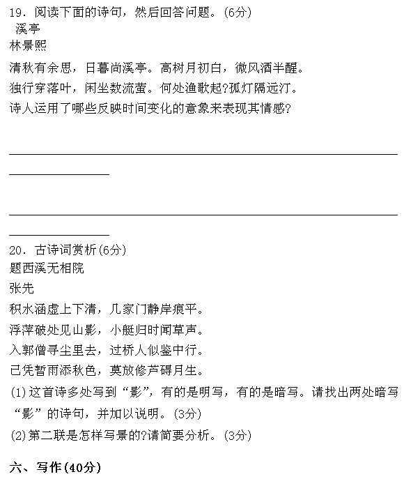 19.[参考答案]本题考查考生对时间意象的把握,从季节的角度看,显示时间的意象是清秋、落叶;从一天的时间角度看,显示时间的意象是日暮、月初白、流萤和孤灯。