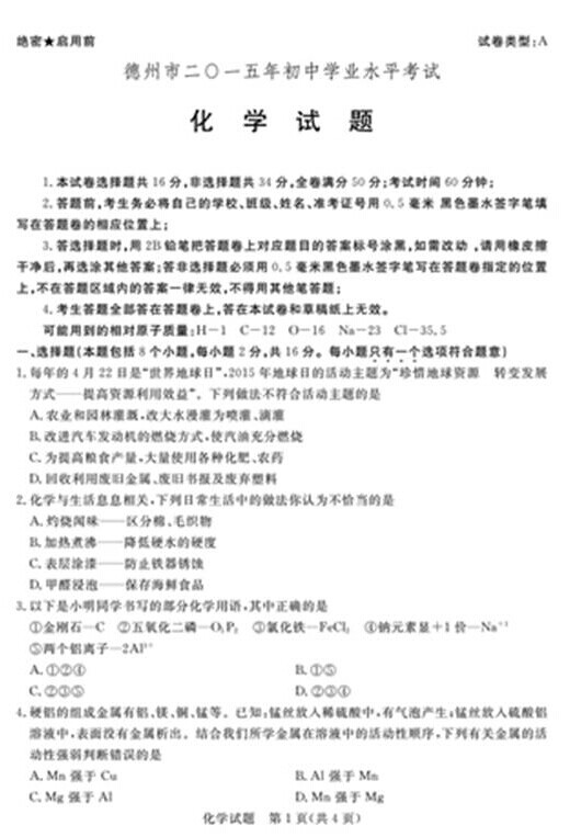 2015年山东德州中考化学真题(已公布).docx