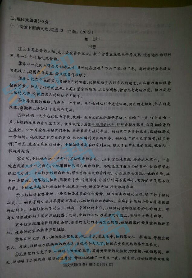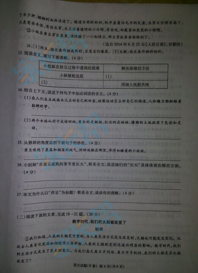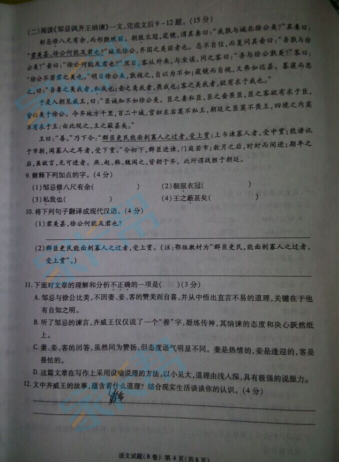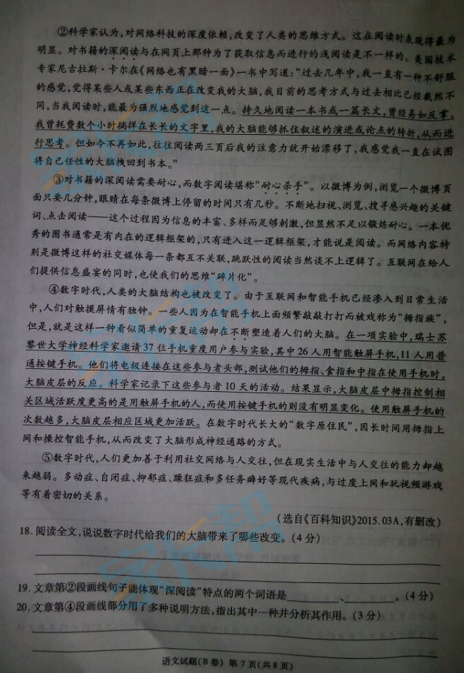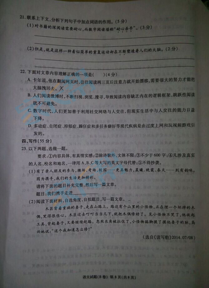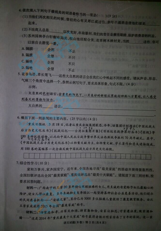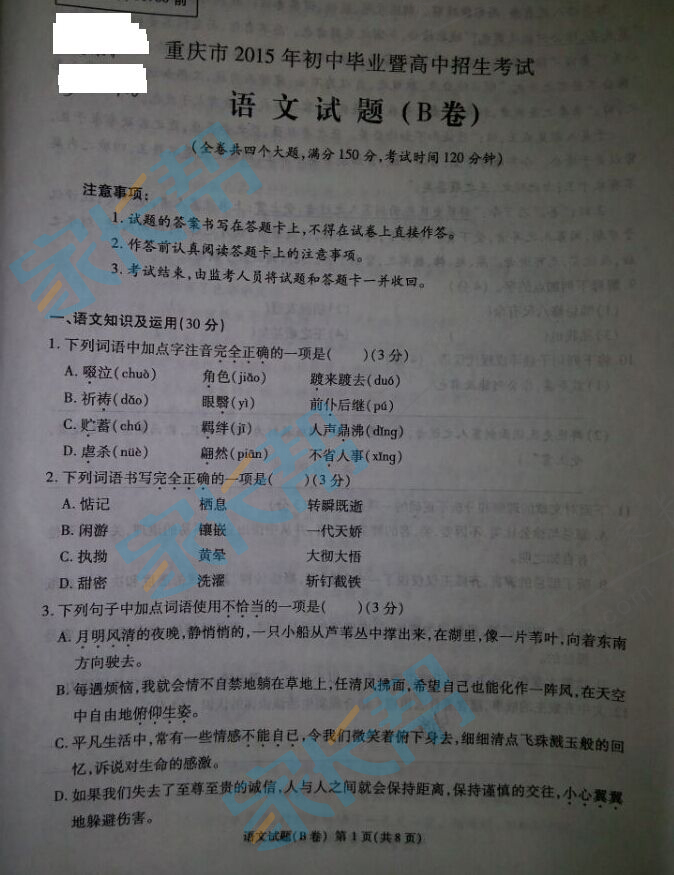 2015年重庆涪陵中考语文试题B卷(已公布)