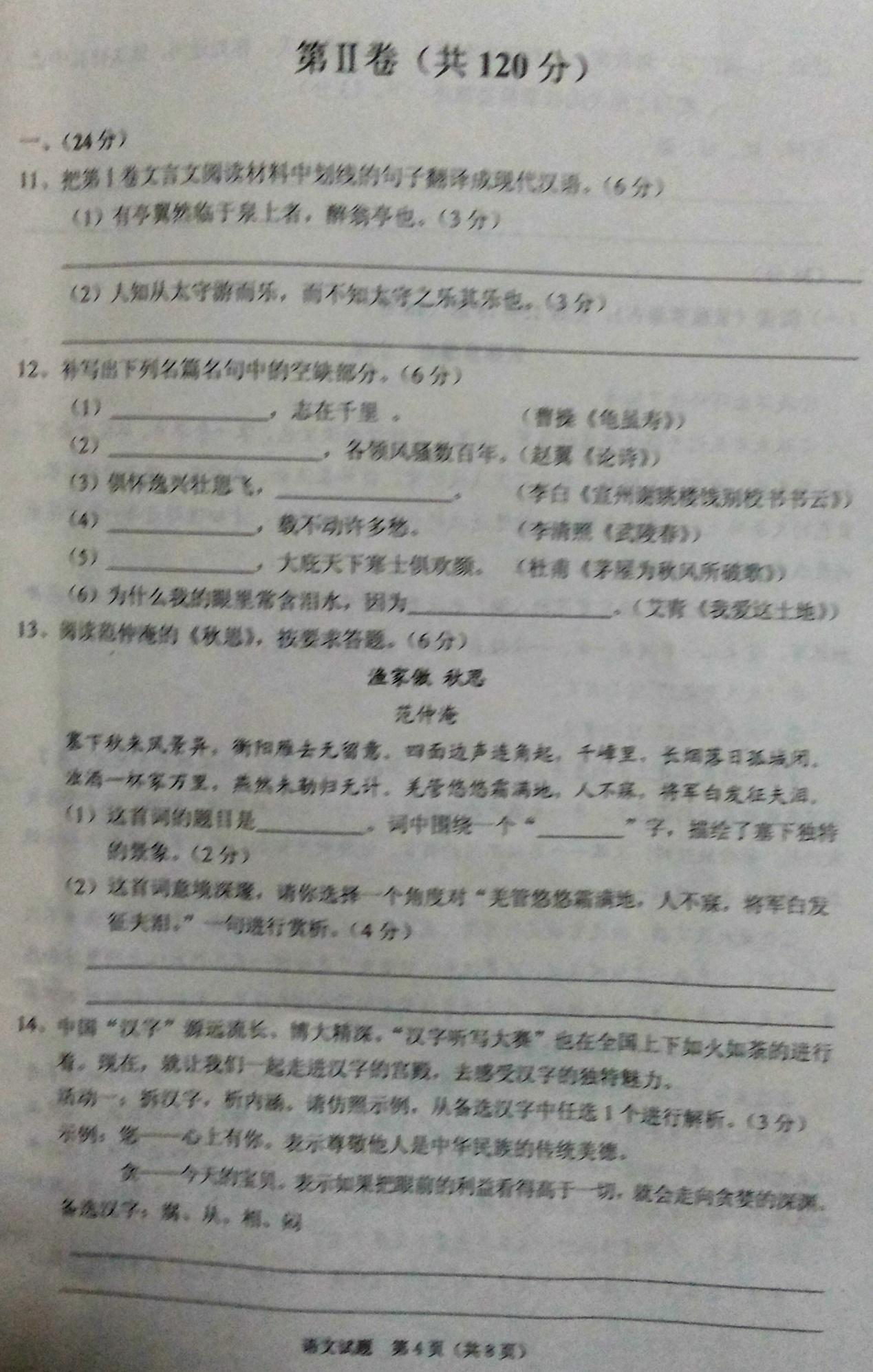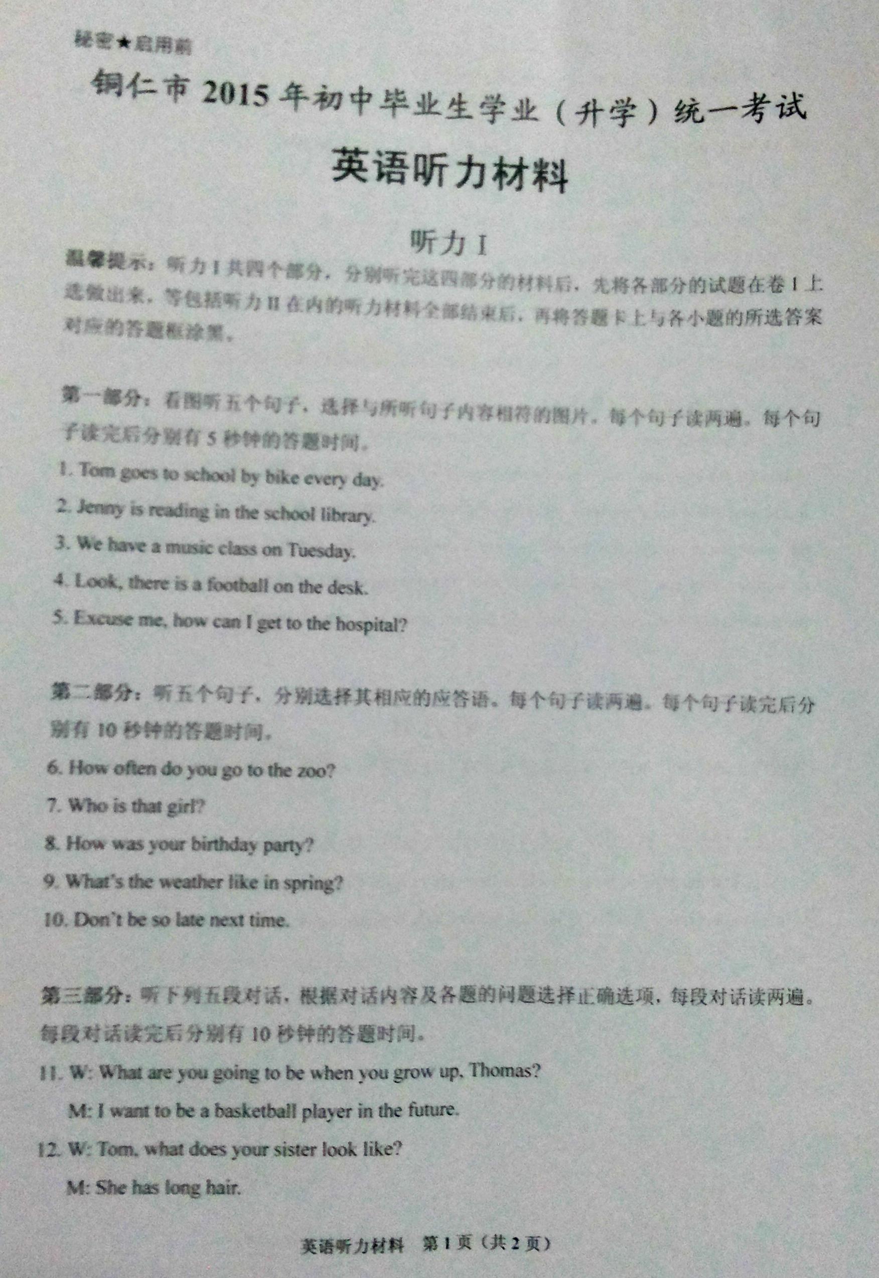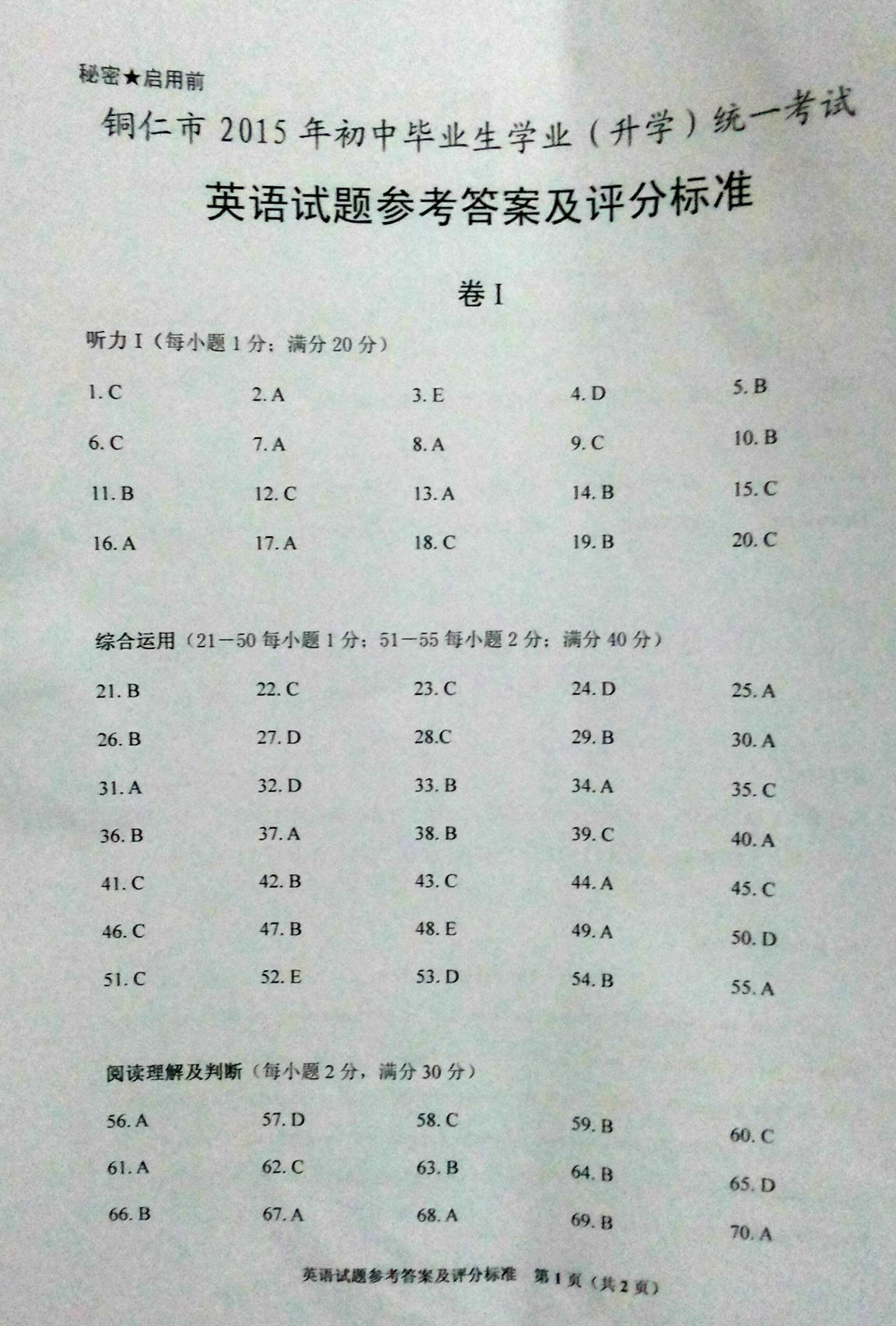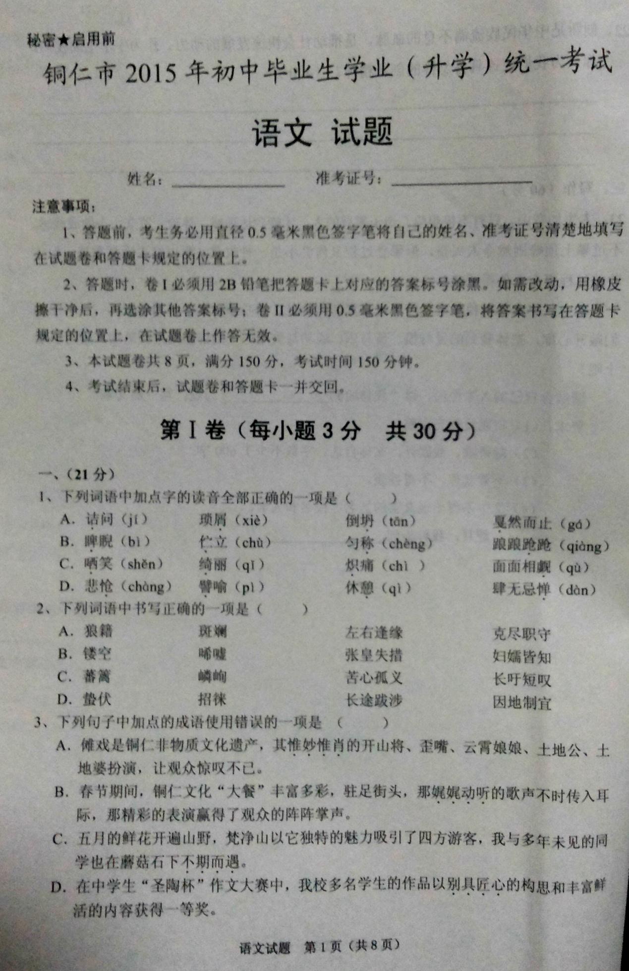 2015年贵州铜仁中考语文真题及答案(已公布)