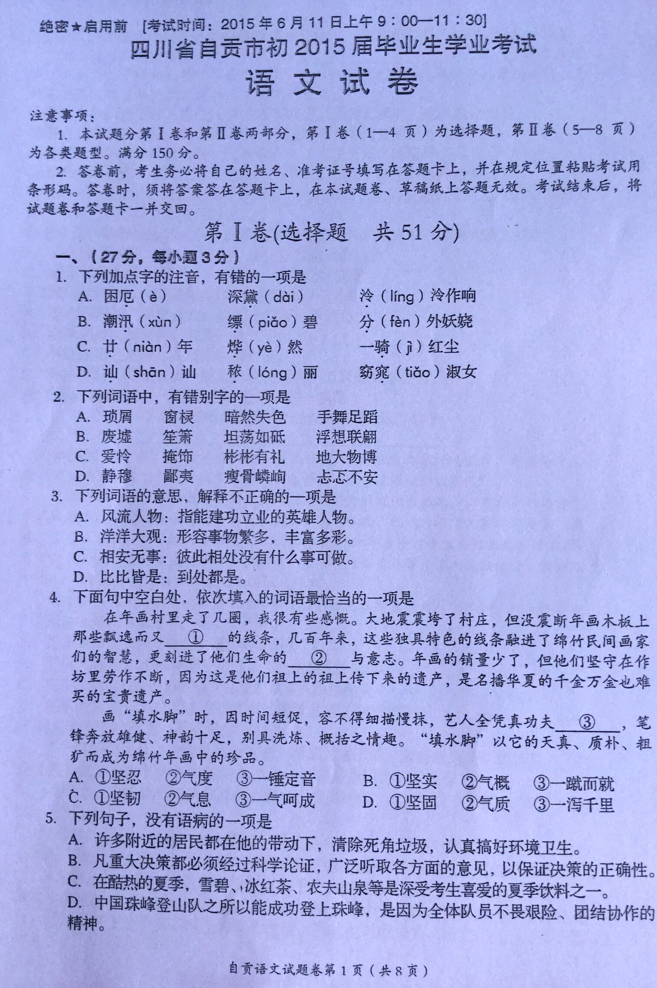 2015年四川自贡中考语文真题(已公布).docx