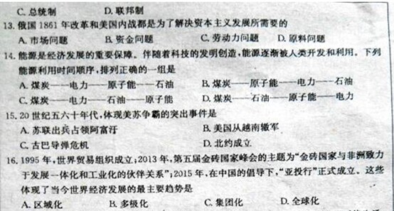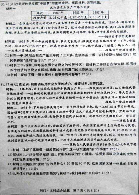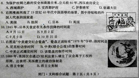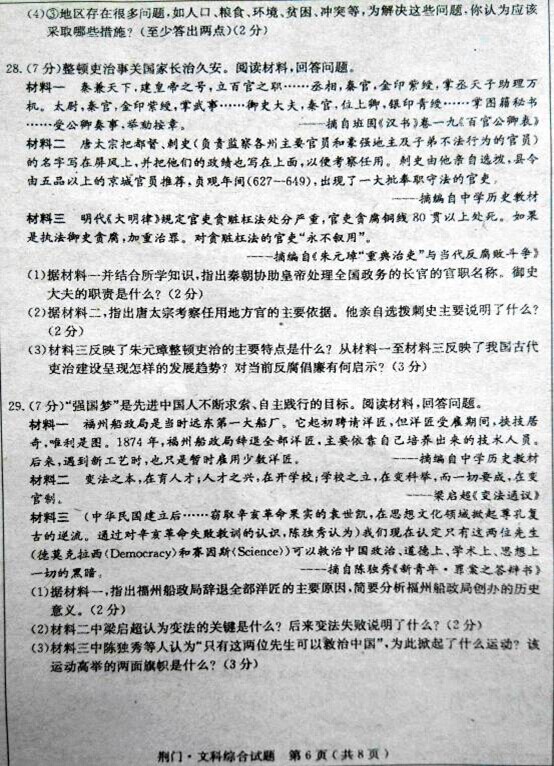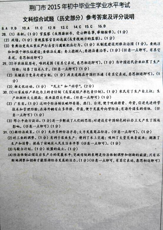 2015年湖北荆门中考历史真题及答案(完整版)