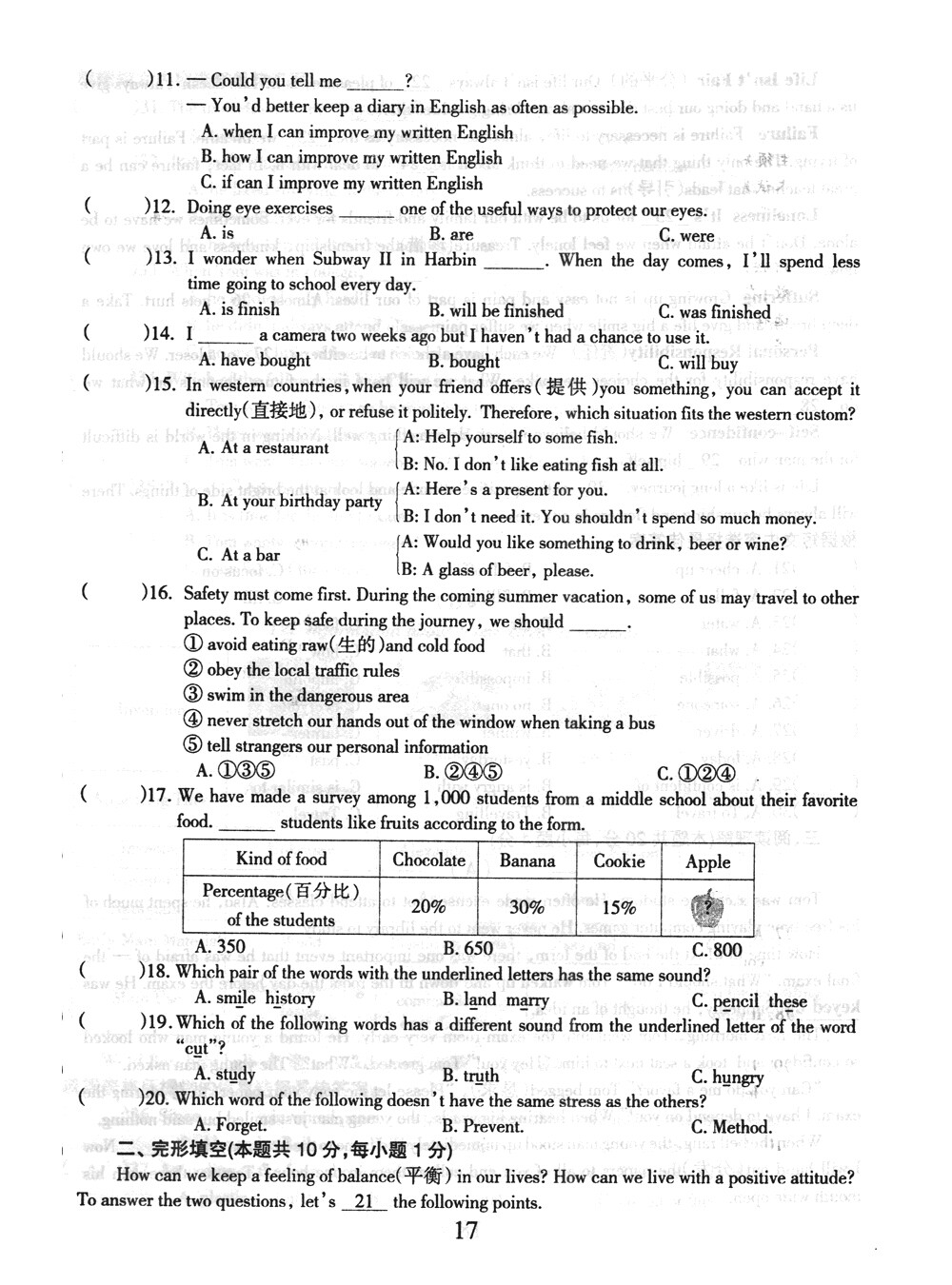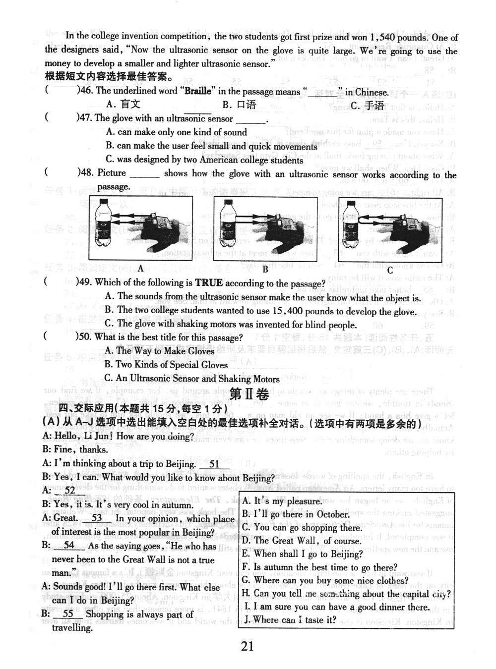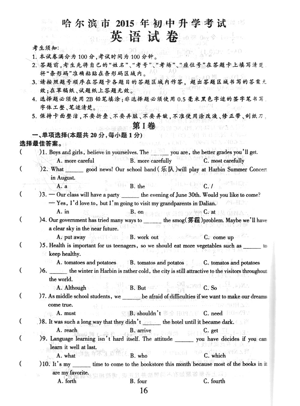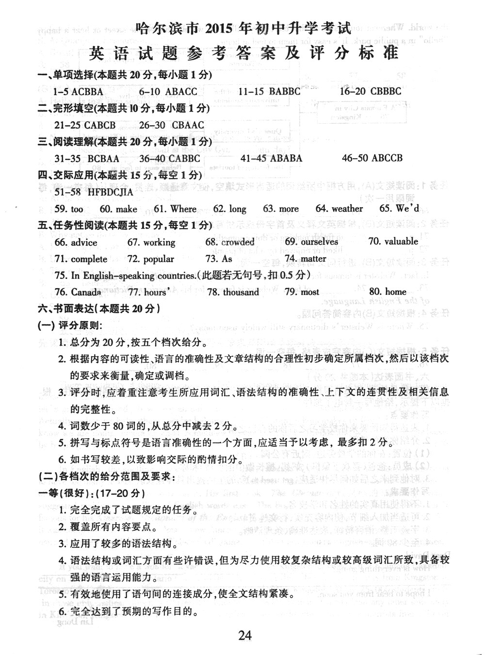 2015年黑龙江哈尔滨中考英语试卷及答案(完整版)
