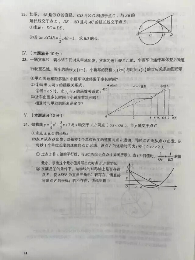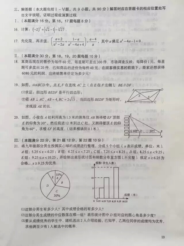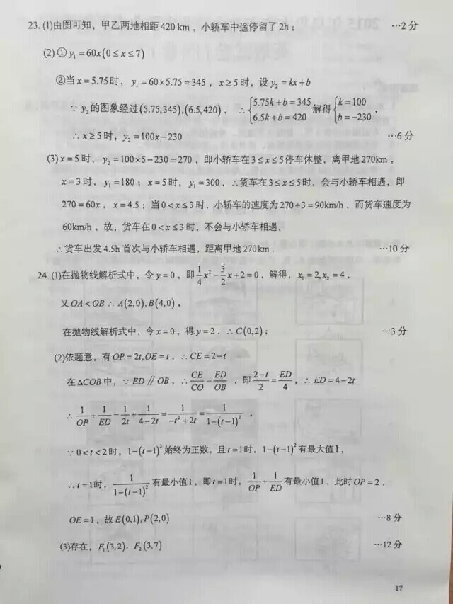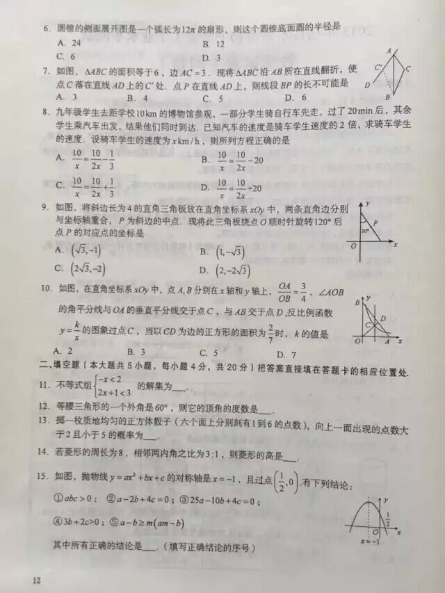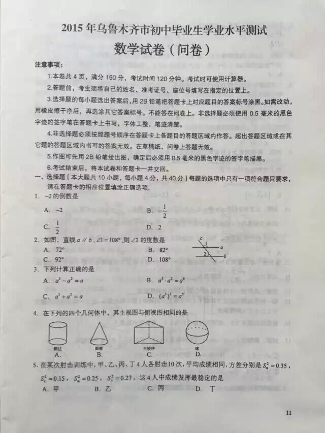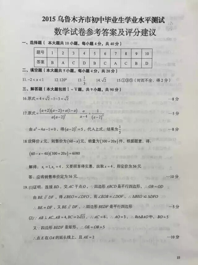 2015年新疆乌鲁木齐中考数学真题及答案(完整版)