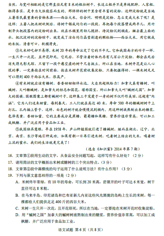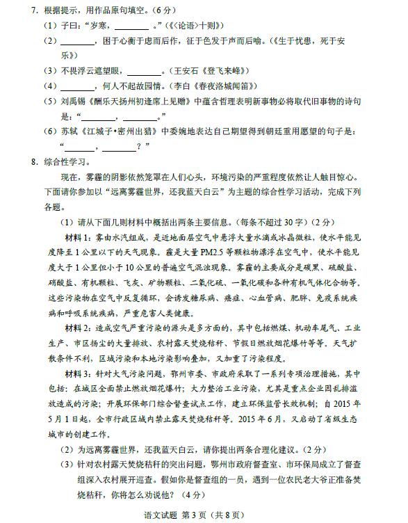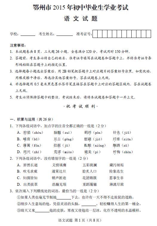 2015年湖北鄂州中考语文真题及答案(完整版)