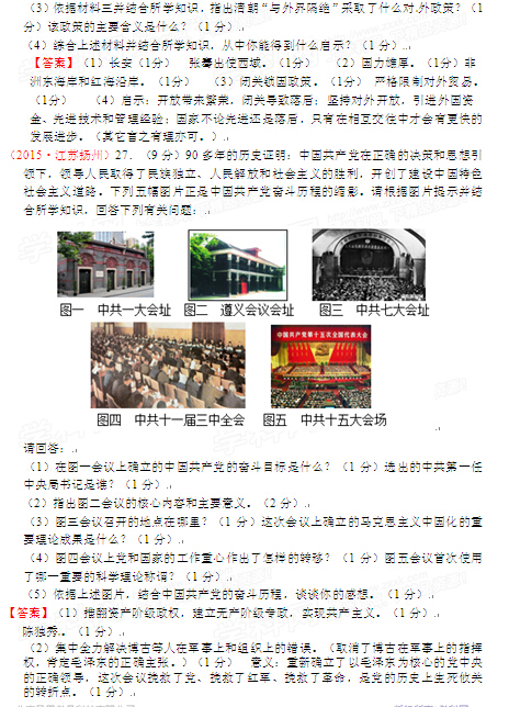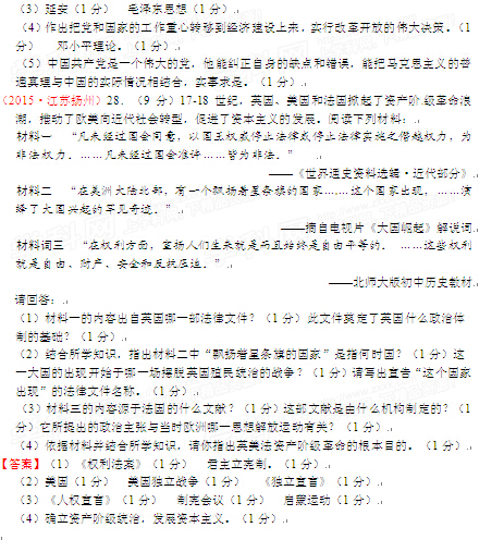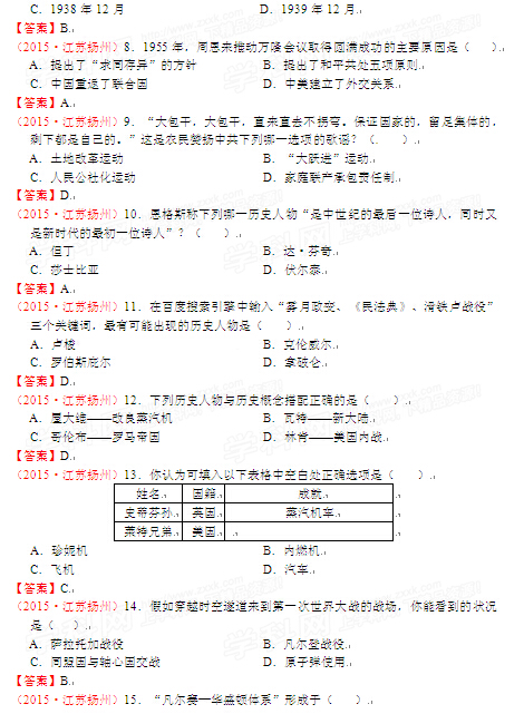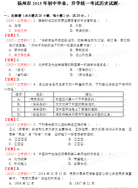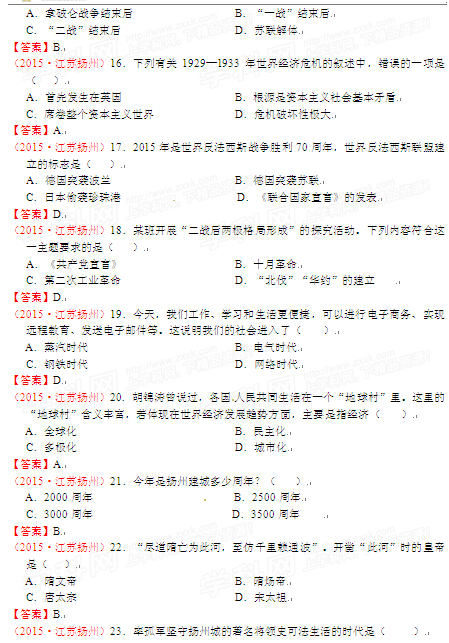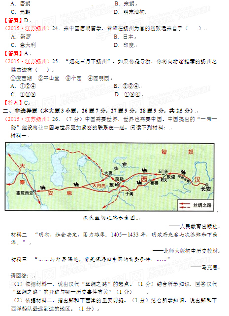 2015年江苏扬州中考历史试卷及答案(完整版)